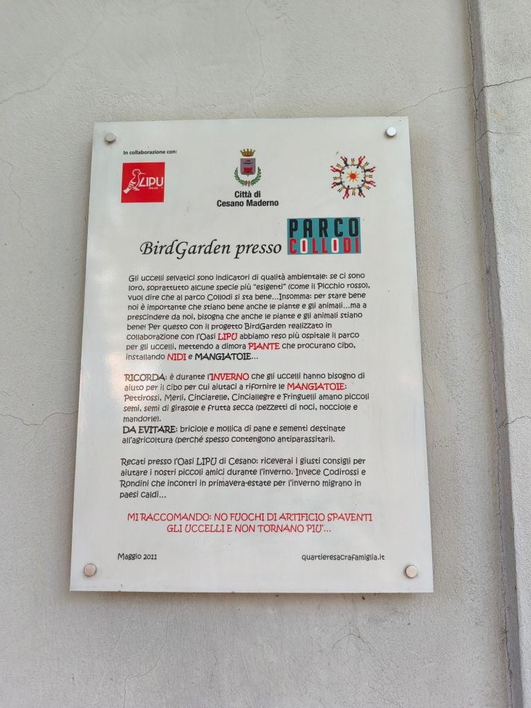 - con l’Oasi Lipu: su una delle pareti dove c’è il disegno gigante di Pinocchio si notano delle casette degli uccelli realizzate dall’Oasi Lipu (Lega Italiana Protezione Uccelli) – sede di Cesano Maderno, con anche una breve spiegazione in cui i volontari fanno notare che gli uccelli sono indicatori di qualità; se ci sono loro il parco sta bene;