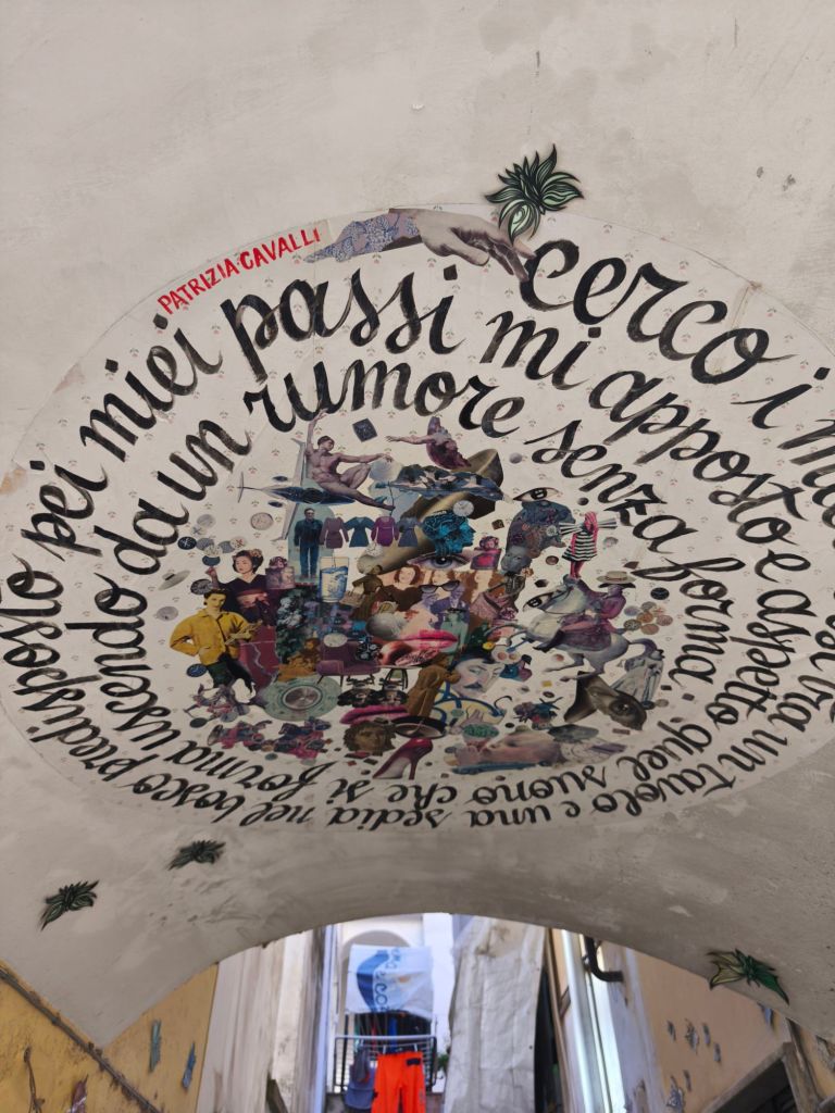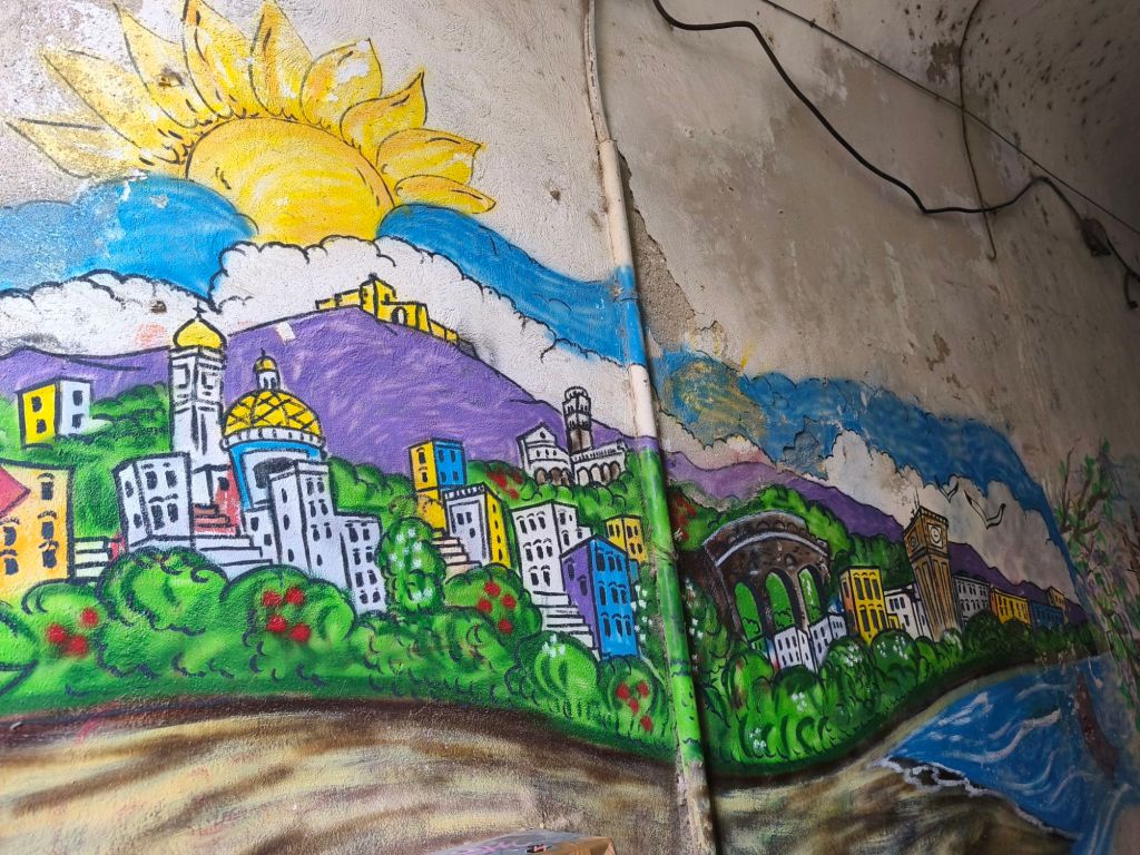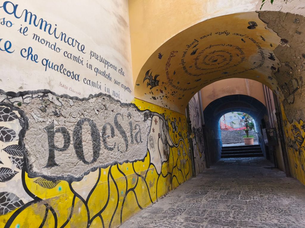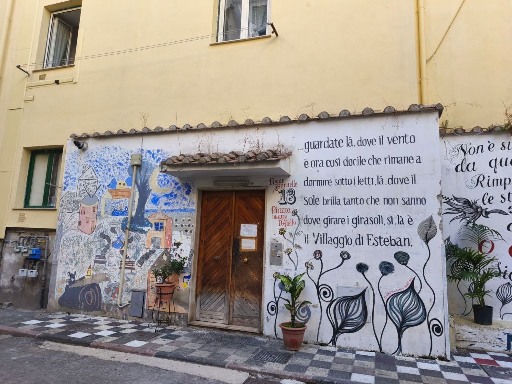 Ed è proprio in uno di questi angoli nascosti di Salerno, tra pietra antica e silenzio, che ho trovato una piccola meraviglia urbana: i murales di Vicolo Santa Maria del Domno. Un vicolo stretto, quasi timido, ma pieno di vita, colore e poesia murale, proprio nel cuore del centro storico.