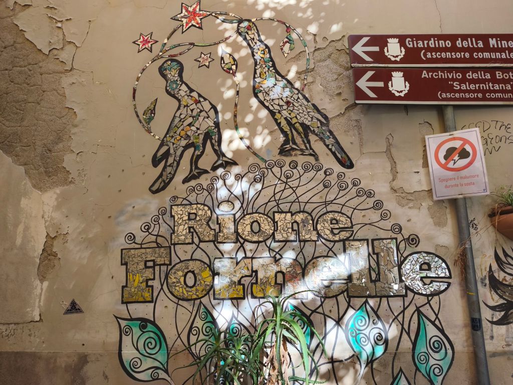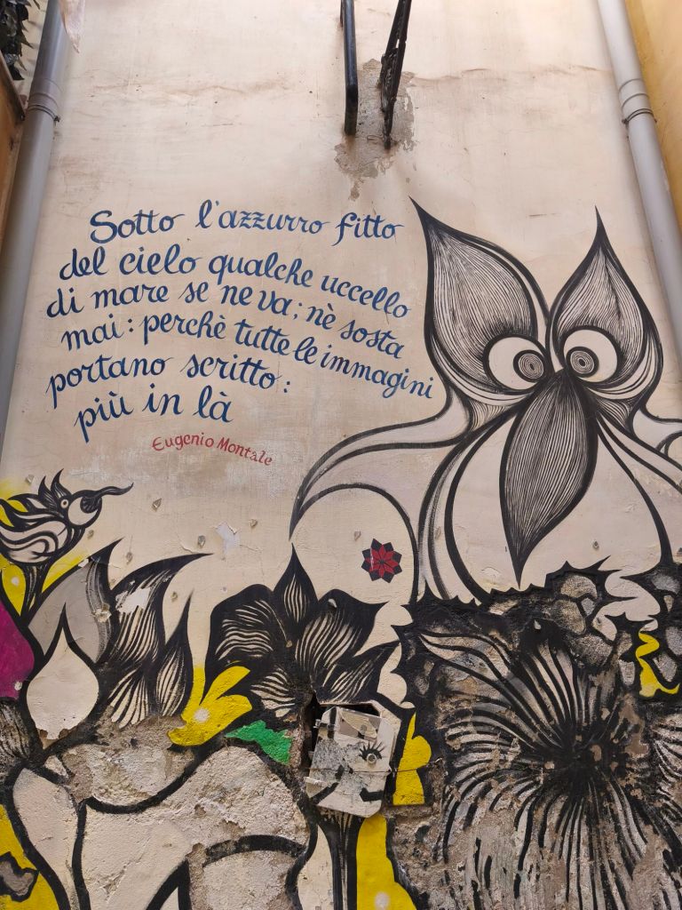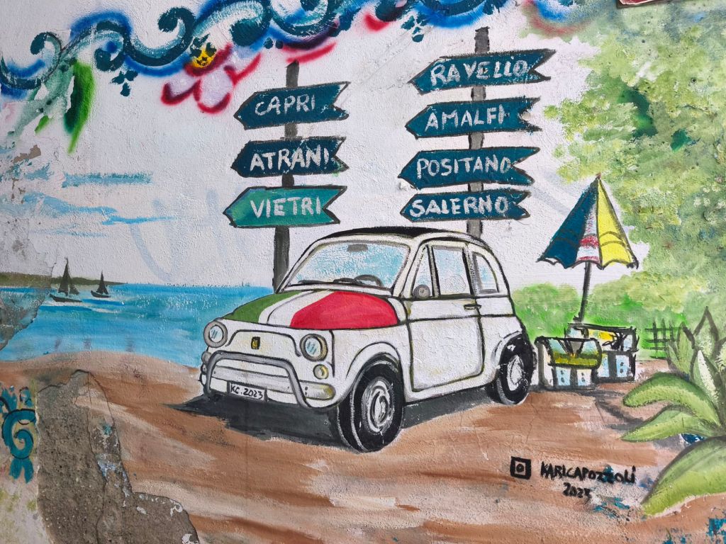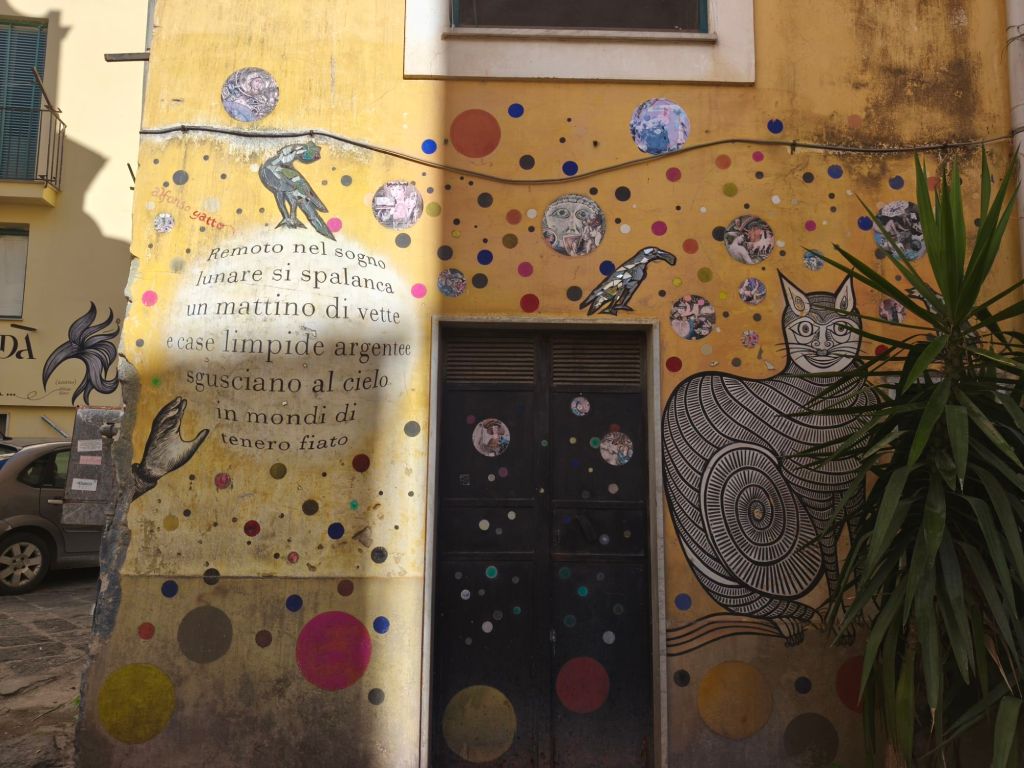 Ed è proprio in uno di questi angoli nascosti di Salerno, tra pietra antica e silenzio, che ho trovato una piccola meraviglia urbana: i murales di Vicolo Santa Maria del Domno. Un vicolo stretto, quasi timido, ma pieno di vita, colore e poesia murale, proprio nel cuore del centro storico.