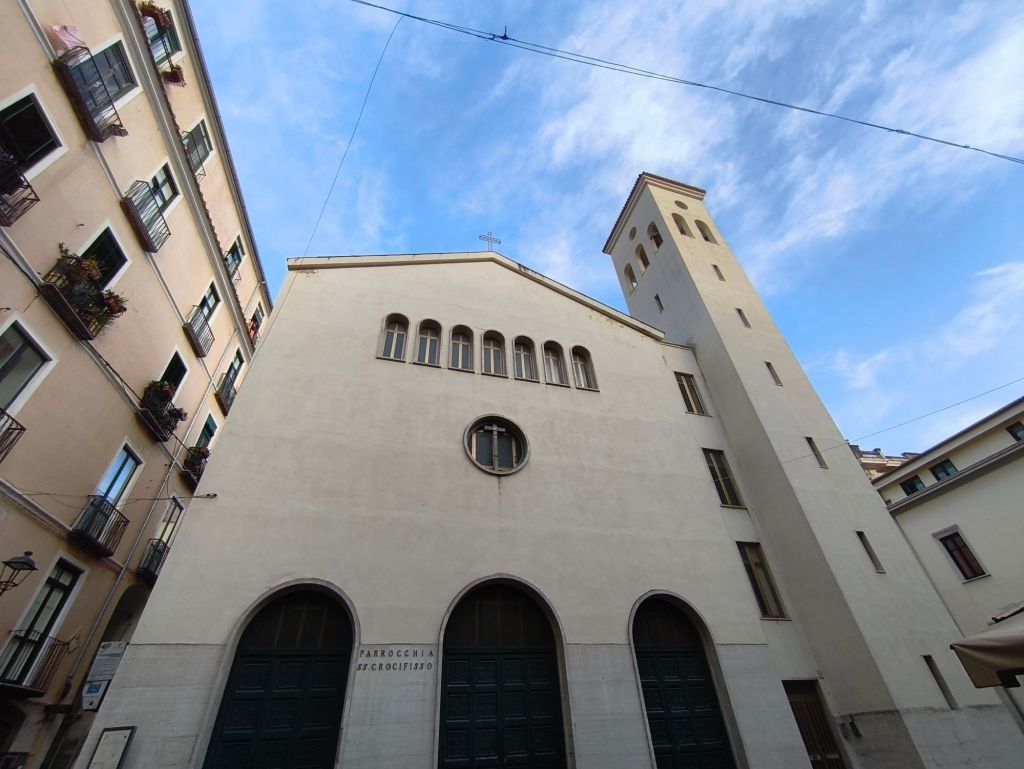 Ma se alzi gli occhi e rallenti il passo, ecco che compare: la Chiesa del Santissimo Crocifisso, elegante, raccolta, silenziosa. Uno di quei luoghi dove il tempo si ferma e ti sussurra all’orecchio storie di fede, arte e città. La chiesa si trova in via dei Canali, una delle stradine più affascinanti della Salerno antica. Non è lontana dal Duomo, ma abbastanza nascosta da sembrare un piccolo segreto urbano. Il portale è sobrio ma raffinato, incorniciato da una facciata in stile barocco settecentesco che racconta già tanto di quello che ti aspetta all’interno. Appena entri, ti trovi avvolta da un’atmosfera calda e teatrale: oro, stucchi, altari, marmi policromi. La chiesa, ristrutturata nel Settecento, è un autentico scrigno barocco, ma senza eccessi. È intima, equilibrata, sorprendente. E la luce che entra dalle finestre alte mette in risalto i dettagli con delicatezza.