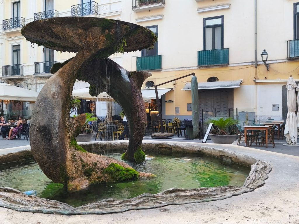Un punto importante è anche la Fontana dei Delfini. Appena arrivi nella celebre “Rotonda”, dove il centro storico incontra il mare, i tuoi occhi saranno subito catturati da una fontana ottagonale su due gradoni che si apre come un palcoscenico d’acqua. Al centro, due delfini stilizzati si ergono con eleganza e delicatezza, sorreggendo un piatto metallico da cui zampilla un getto sottile d’acqua. È un soggetto semplice, ma reso sorprendentemente poetico dalla forma sospesa e dalla lieve asimmetria tra le figure che li rende quasi umani. Questa fontana è un regalo al salotto buono di Salerno, disegnata dall’architetto, scultore e designer Riccardo Dalisi nel 1997 durante la riorganizzazione di Piazza Flavio Gioia. Con la sua firma, Dalisi ha trasformato uno spazio urbano in un piccolo teatro pubblico, facendo dialogare acqua, scultura e architettura con grazia mediterranea.