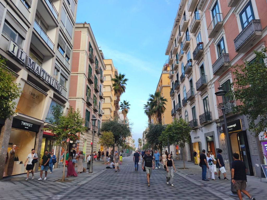 Da Piazza Vittorio Veneto è un attimo vivere il centro, infatti da questa piazza inizia anche Corso Vittorio Emanuele. Sul Corso trovi negozi di ogni tipo: dai grandi brand internazionali alle boutique più ricercate, librerie storiche, profumerie, e piccoli shop artigianali che vendono ceramiche, bijoux fatti a mano e… limoncello (perché sì, la Costiera comincia proprio qui!). Per chi ama lo shopping senza caos, questo è il paradiso: tutto ordinato, pulito, a misura d’uomo. E con il mare a pochi passi, se vuoi fare una pausa vista blu basta deviare per una traversa. Se visiti Salerno tra novembre e gennaio, il Corso si trasforma in un tunnel luminoso spettacolare durante le celebri Luci d’Artista: installazioni luminose che fanno brillare tutta la città, richiamando visitatori da ogni parte d’Italia. Passeggiare qui diventa un’esperienza incantata, tra alberi di luce, stelle giganti e proiezioni animate sui palazzi.
