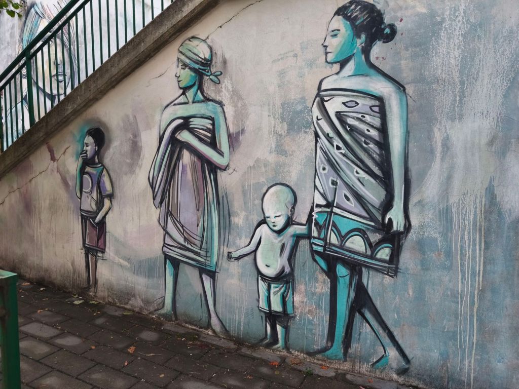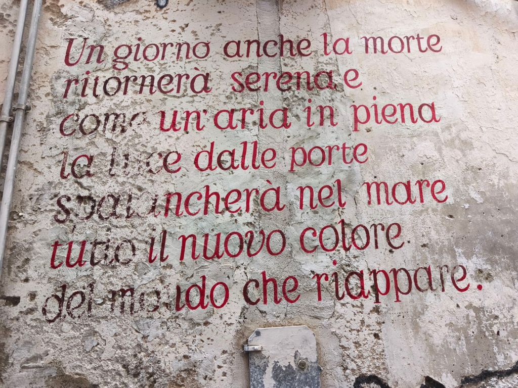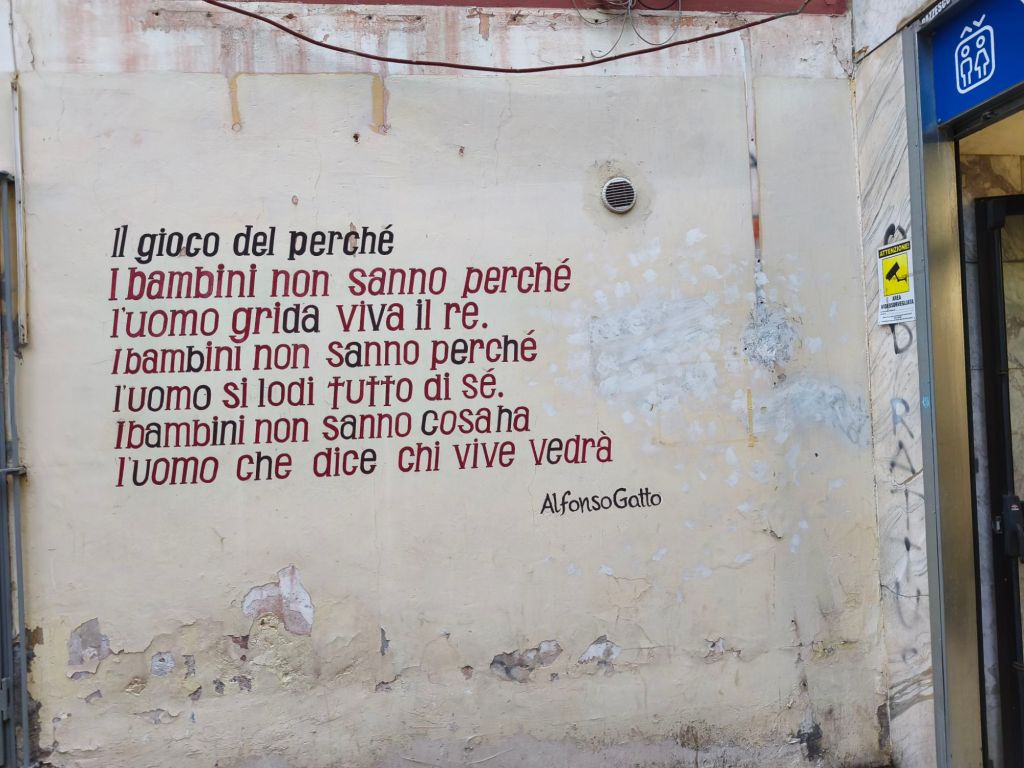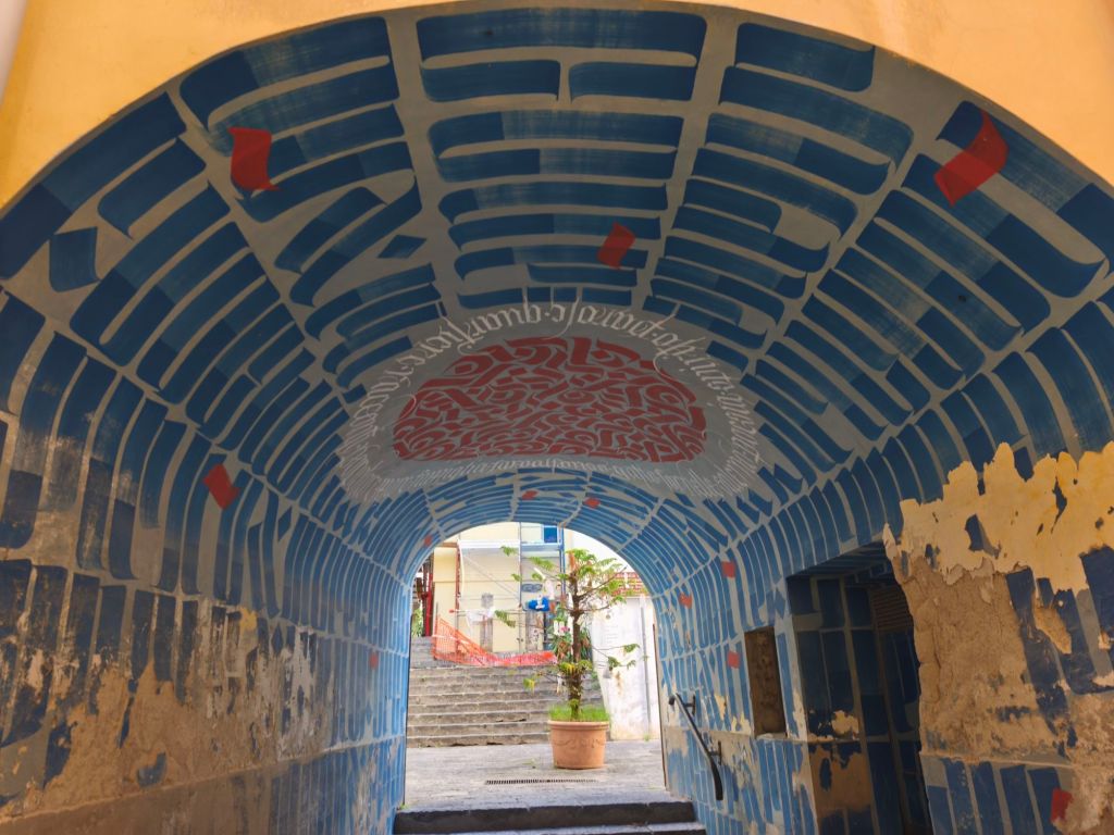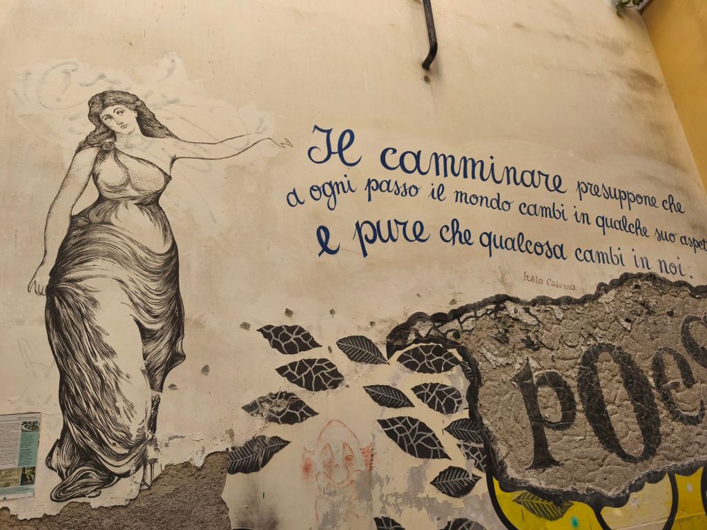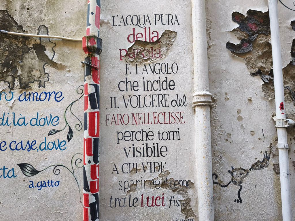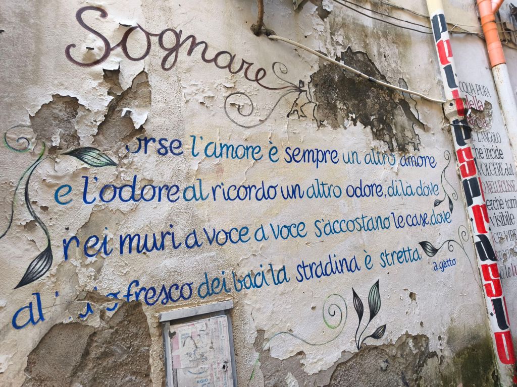 È una street art intima, che si fonde con la pietra viva delle case, che spunta tra un’edicola votiva e una finestra antica, senza disturbare — ma lasciando il segno. Qui trovi ritratti femminili, sguardi malinconici, parole scritte come se fossero confidenze sussurrate al muro, messaggi sociali ed esistenziali che parlano di libertà, di resistenza, di speranza.