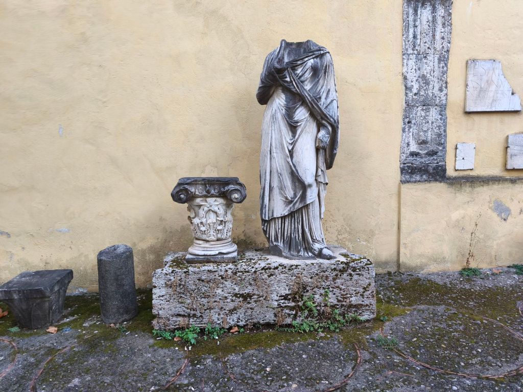 Dall’esterno potresti non immaginare cosa si cela all’interno dell’antico palazzo annesso alla Curia: una sala spettacolare, con colonne romane in perfetto stato, che sembrano ancora sostenere il tempo. Appena entri, ti si apre davanti un ambiente che profuma di storia, con capitelli corinzi, marmi antichi e pareti che raccontano secoli di trasformazioni: da tempio pagano a deposito, da luogo sacro a spazio espositivo. Quello che colpisce di più del Tempio di Pomona è la sovrapposizione di epoche: