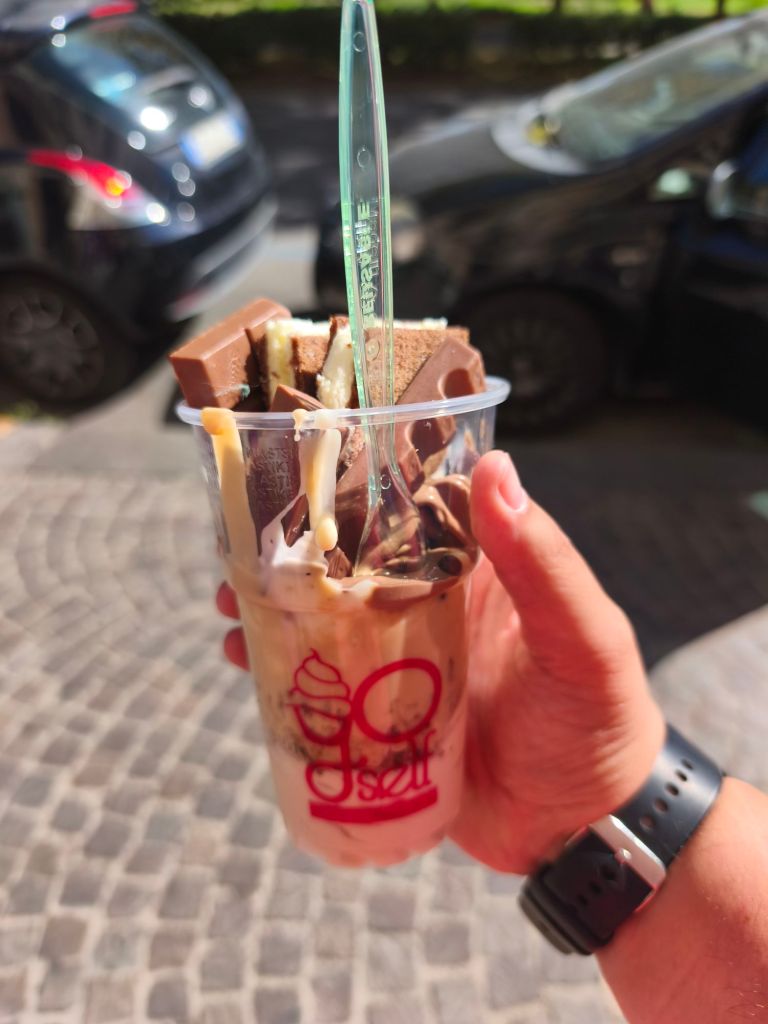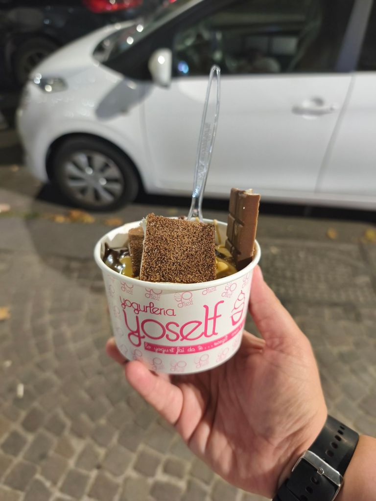 Ho anche trovato la yogurteria dei miei sogni, roba da avercela sempre in casa, se non fossi a dieta. Si chiama Yoself – Yogurteria e Gelateria. Appena entri in questo locale puoi decidere se prendere una maxi coppetta o un bicchiere e dopo puoi inserirci quello che vuoi tra yogurt, gelato, creme, cereali e topping vari. Una volta arrivata in cassa pagherai al peso (io ovviamente sono un animale e non ho mai speso meno di 7.50€)
