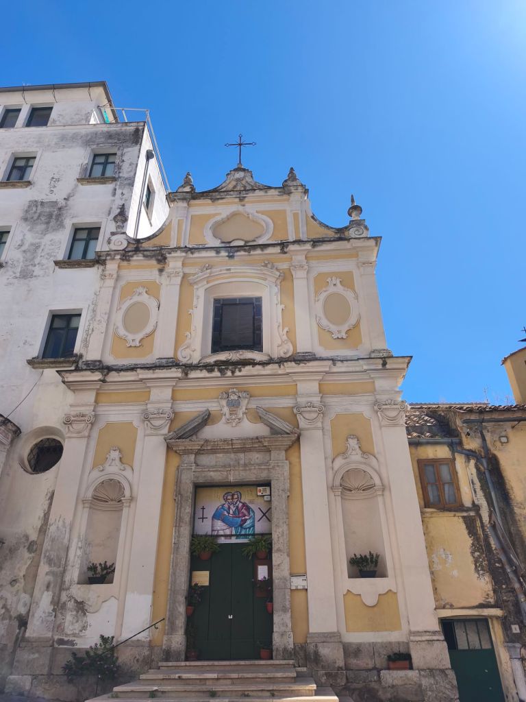 Sulla strada per andare a Vietri sul Mare, c’è la Cappella di Santa Maria degli Angeli, una chiesetta raccolta, silenziosa, intima. Dall’esterno può sembrare semplice, ma appena varchi la soglia, respiri una pace rara. All’interno, custodisce decorazioni sobrie, un altare delicato e un’immagine della Madonna che sembra vegliare su chiunque entri anche solo per un momento.
