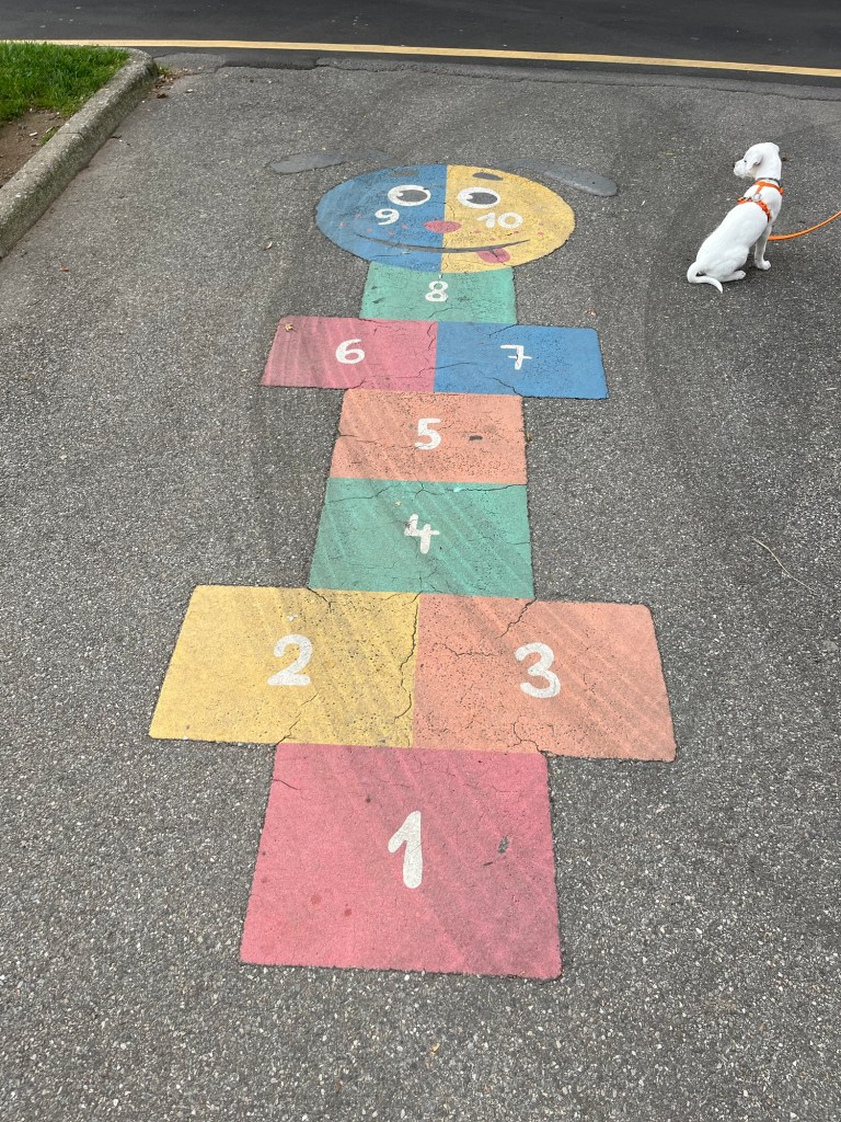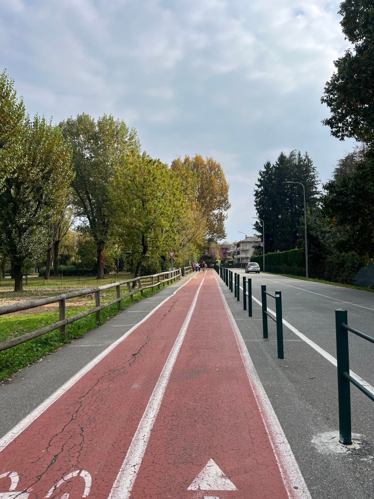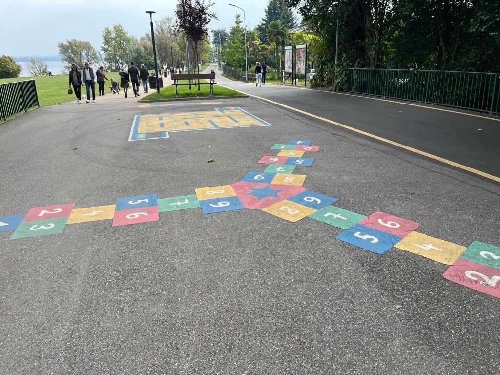 Proprio qui, sul percorso ciclopedonale, ci sono anche dei giochi per bambini disegnati per terra, come Campana e il percorso con le quattro operazioni. Molto bella come idea, per intrattenere i più piccoli durante la camminata!