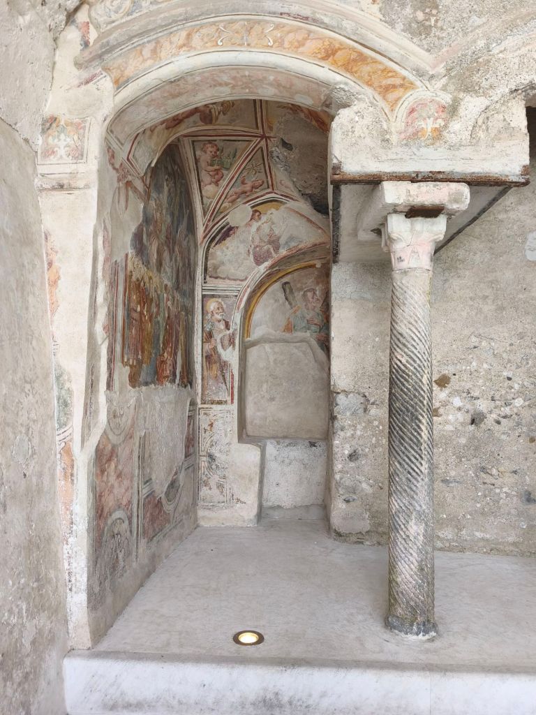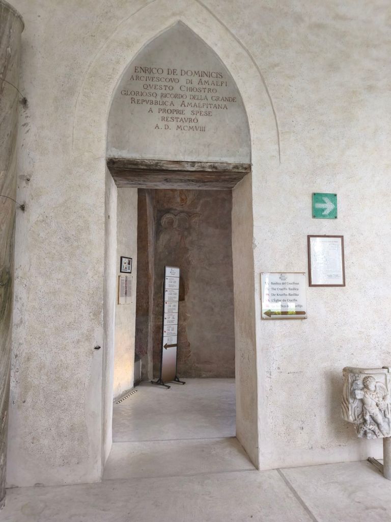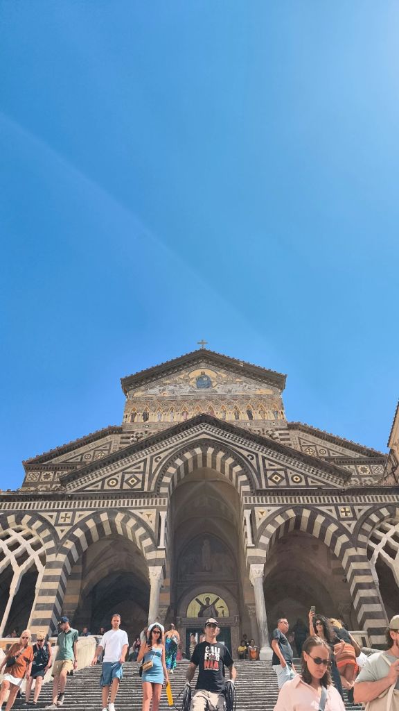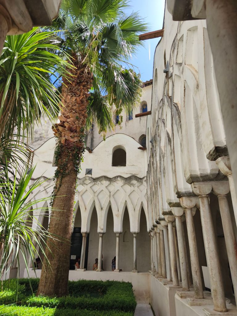 Le sue arcate arabe, i motivi geometrici bizantini e la verticalità romanica si fondono in un’armonia che racconta secoli di incontri tra Oriente e Occidente. È un tempio che non appartiene a un solo tempo né a un solo stile, ma al mare stesso — a quella mescolanza di popoli e culture che Amalfi ha sempre rappresentato. Quando entri, l’aria si fa fresca, profumata d’incenso e di pietra antica. Le voci della piazza si spengono dietro di te, e restano solo il fruscio dei passi e il suono distante di una campana. Le colonne marmoree si alzano leggere, i capitelli decorati con tralci di vite e figure d’angeli, e la luce filtra dalle finestre come acqua dorata. Nell’abside brilla il mosaico del Cristo benedicente, un tripudio di oro e blu che sembra galleggiare nell’ombra come un riflesso di mare al tramonto. Ai piedi dell’altare, riposa il corpo di Sant’Andrea, il patrono di Amalfi, pescatore e apostolo, portato qui nel XIII secolo da Costantinopoli. La cripta che lo custodisce è un piccolo scrigno sotterraneo: volte affrescate, lampade votive, marmi antichi che riflettono la luce tremolante delle candele. Scendendo quei gradini, sembra di lasciare il mondo moderno per entrare nel cuore profondo della fede e della storia. Lì, in quel silenzio, puoi quasi sentire il respiro dei secoli — il canto dei monaci, le preghiere dei marinai che partivano affidando la vita al santo, e le lacrime di chi restava ad attendere sulla riva.