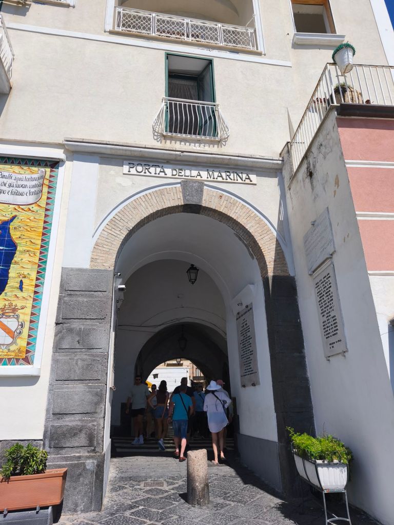 Porta della Marina è tutto ciò che resta delle antiche mura difensive che proteggevano Amalfi, quando era una potenza marinara e temeva più dei pirati saraceni che delle tempeste. Era un arco robusto, costruito in pietra vulcanica, scura e ruvida, con un’aria di guardia silenziosa. Di notte, le torce accese ai suoi lati proiettavano ombre tremolanti sui volti dei marinai che rientravano, stanchi e salati di mare, dopo viaggi lunghi mesi. Attraversandola, si passava dall’odore d’alghe e catrame del porto al profumo di pane caldo, limone e basilico delle botteghe interne. Era un passaggio, ma anche un rito. I capitani, raccontano le cronache, si fermavano un istante prima di entrare, posando la mano sulla pietra levigata, come a ringraziare gli dèi o la Vergine per il ritorno salvo. Sopra l’arco, si dice che in certi secoli fosse affisso lo stemma della Repubblica, con la croce bianca in campo azzurro, e che i custodi della città, armati di lance, controllassero chi entrava e chi usciva. Di giorno si sentivano i colpi secchi dei martelli dalle barche in costruzione, il richiamo dei pescatori; di notte, il mare arrivava fin quasi sotto la porta, sussurrando segreti che la pietra, da secoli, conserva.