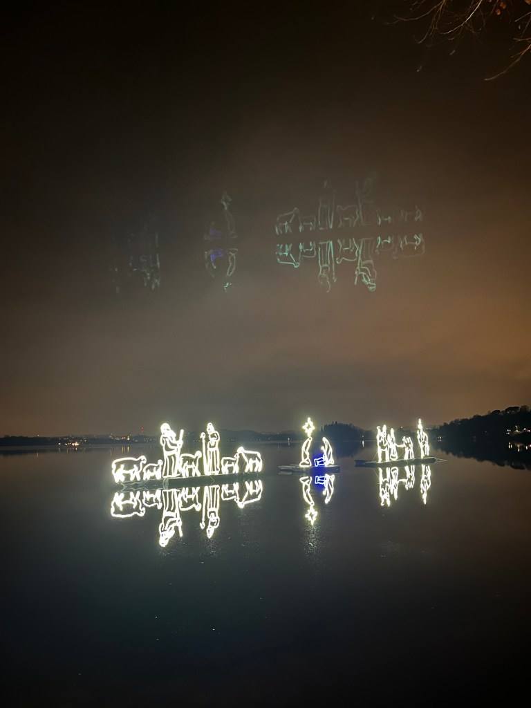 Nel cuore del lago, una meravigliosa rappresentazione della Natività prende vita. Uno spettacolo di luci e colori si riflette sulle acque tranquille, creando un’atmosfera magica che attira visitatori da ogni dove. I pastori, le pecore e la Sacra Famiglia sono realizzati in legno e illuminati da migliaia di luci scintillanti, rendendo il presepe un’autentica opera d’arte galleggiante.