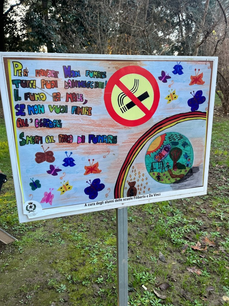 All’interno del parco si possono trovare un’area giochi attrezzata e un cartello fatto dai bambini in cui si chiede di non fumare all’interno di esso (idea magnifica, la farei in ogni parco!)
