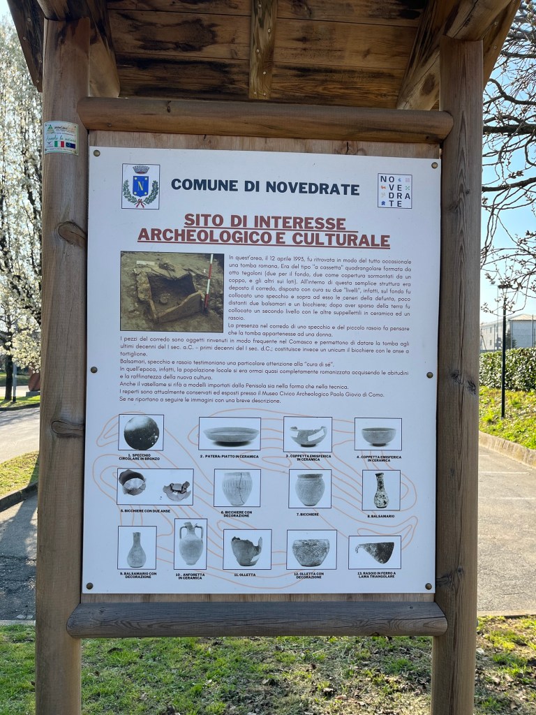 Di fianco al Campo Sportivo Comunale e di fronte al Cimitero di Novedrate c’é un piccolo Sito di interesse archeologico e culturale. La bacheca racconta che, in quest’area, il 12 aprile 1993 é stata ritrovata in maniera del tutto occasionale una tomba romana. Era del tipo “a cassetta” quadrangolare formata da otto tegoloni. All’interno di questa semplice struttura era disposto il corredo, disposto con cura su due livelli. All’interno sono stati trovati uno specchio e un piccolo rasoio, questo ha fatto pensare che questa fosse una tomba di una donna. Oltre a questi due oggetti, é stato trovato anche un balsamari, indice di un’importante cura da parte della proprietaria.