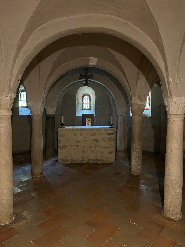 La facciata si presenta semplice e severa, secondo il gusto medievale. Il campanile accompagna il complesso con eleganza e rafforza il senso di verticalità del luogo. Entrando, l’interno sorprende per la sua purezza architettonica: tre navate scandite da colonne e pilastri guidano lo sguardo verso l’abside, mentre la luce filtra con discrezione e crea un’atmosfera meditativa.